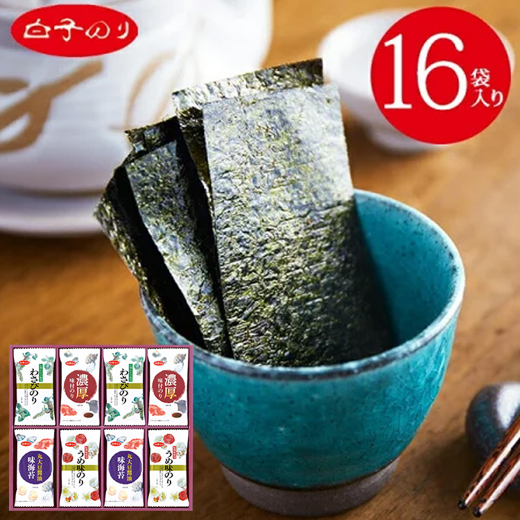 ●内容 : 信州わさび使用わさびのり(8切5枚)×4袋、濃厚味付のり(8切5枚)×4袋、丸大豆醤油味のり(8切5枚)×4袋、紀州梅使用うめ味のり(8切5枚)×4袋