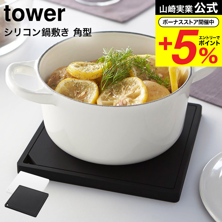 山崎実業 tower シリコン鍋敷き 角型 タワー キッチン 公式 ホワイト/ブラック 送料無料 シリコーン 四角 吊り下げ 軽量 厚さ1cm 丸洗い可