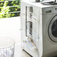 磁石で洗濯機横に簡単取付!かさばる洗濯ハンガーをスリムに一括収納!洗濯物をその場でハンガーに掛けられるから動作がスムーズ!取り出しやすく、使った後はスリムに収納。洗濯バサミも収納可能。横向き使用時にブラシなどを掛けられるフック3個付き。ピンチハンガー・お掃除ツールバスブーツの収納にも使えます。付属の木ネジで簡単取り付け。ランドリールームやクローゼットの壁面に。洗濯ハンガーを洗濯機横のすきまにスッキリ収納。
