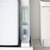 洗濯機の排水口とホースを隠しながら、その上を有効活用できる伸縮ラック。伸縮できるから洗濯機のサイズや防水パンの内寸サイズに合わせてサイズを調整できます。