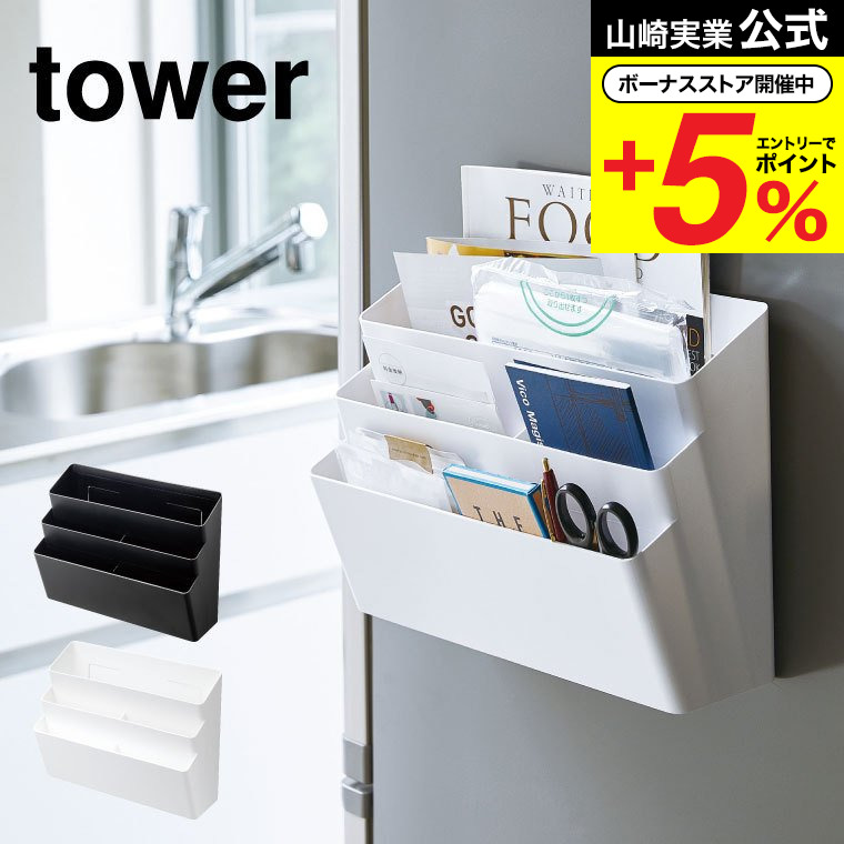 山崎実業 tower 冷蔵庫横マグネット収納ポケット 3段 タワー キッチン 公式 ホワイト/ブラック キッチン収納 レシピブック入れ 小物入れ 送料無料