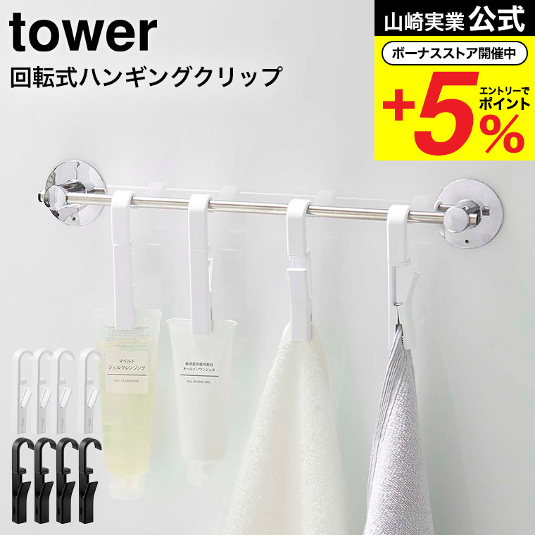山崎実業 tower 回転式ハンギングクリップ 4個組 タワー キッチン 公式 ホワイト/ブラック 5491 5492 /洗面 お風呂 吊り下げ 収納