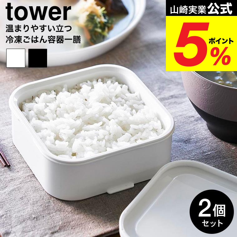 山崎実業 tower 温まりやすい立つ冷凍ごはん容器 タワー 一膳 2個組 公式 1471 1472 ホワイト ブラック / 冷蔵庫内 収納