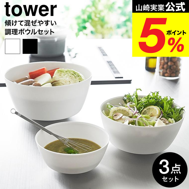 山崎実業 tower 傾けて混ぜやすい調理ボウル タワー 3点セット 電子レンジ対応 公式 1391 1392 ホワイト ブラック 送料無料 / 800ml 1.8L 4L