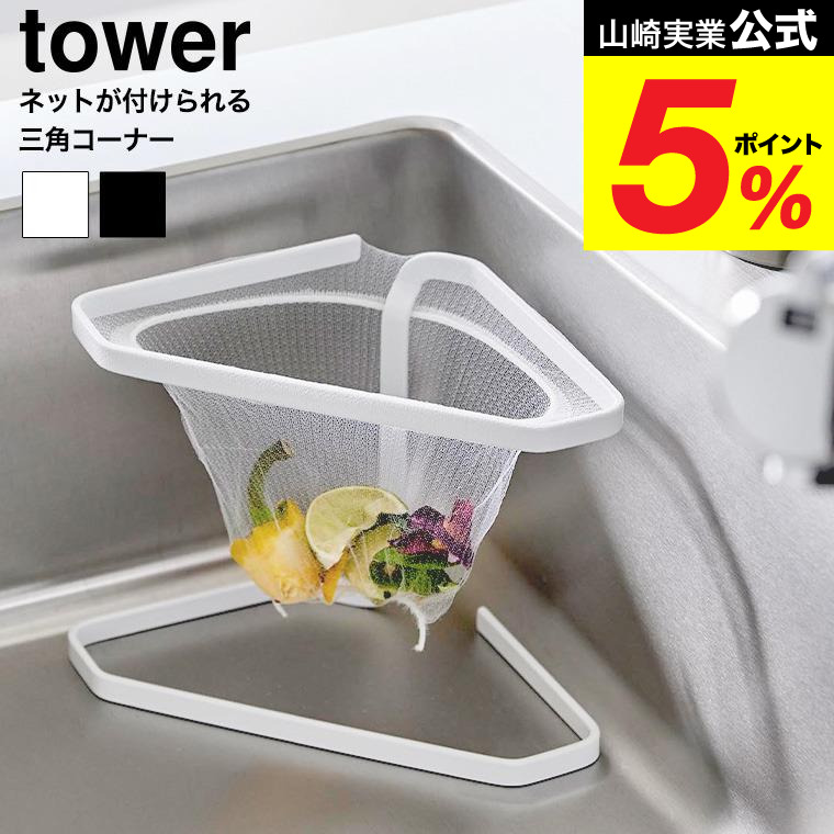山崎実業 tower 水切りネットが付けられる三角コーナー タワー 公式 キッチン 1555 1556 ホワイト ブラック 送料無料 / 水切りネットホルダー