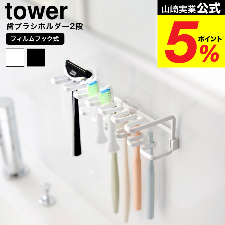 山崎実業 tower フィルムフック歯ブラシ&替え歯ブラシホルダー タワー 2段 公式 10480 10481 ホワイト ブラック 送料無料 / 歯ブラシホルダー