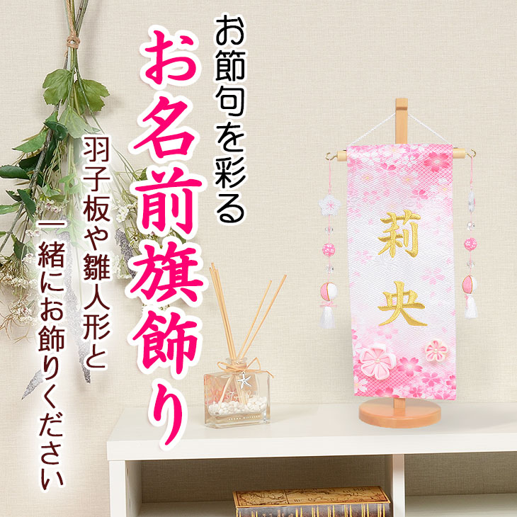 雛人形や羽子板飾りを華やかに演出するお名前旗飾り 名入れタペストリー。お誕生日や記念日のプレゼントにも最適です。