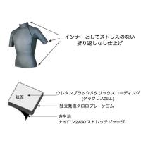 肌側には独立発砲クロロプレーンゴムにウレタンブラックメタリックスコーディング加工を施すことにより、高い保温蓄熱効果と断熱機能に優れた素材です。 また、タックレス加工によりストレスの少ないスムーズな着脱を可能としています。