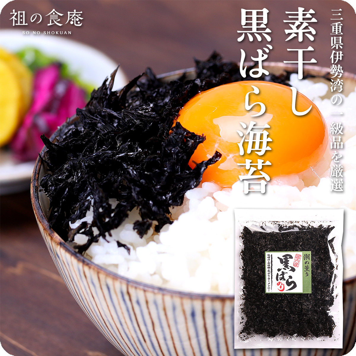 三重県伊勢湾でとれる海苔の原藻を手でバラし、軽く水洗いして乾燥させた一級品の素干し黒ばら海苔を数量限定販売!非加熱なので焼き海苔より風味・旨味が強く栄養価も高いのが特徴です。すべて手作業のため大量生産ができない数量限定の希少品で、漁師のまかない海苔とも言われいています。乾燥状態のままお味噌汁に入れたり、うどんや蕎麦、ラーメン、パスタなど汁物に入れる他、卵かけご飯や納豆に入れても美味です。その他のオススメの食べ方としては、佃煮風に煮込んで自家製の味付けで海苔の佃煮にしたり、ごま油で軽く炒めて自家製の韓国海苔風のおつまみも絶品です。