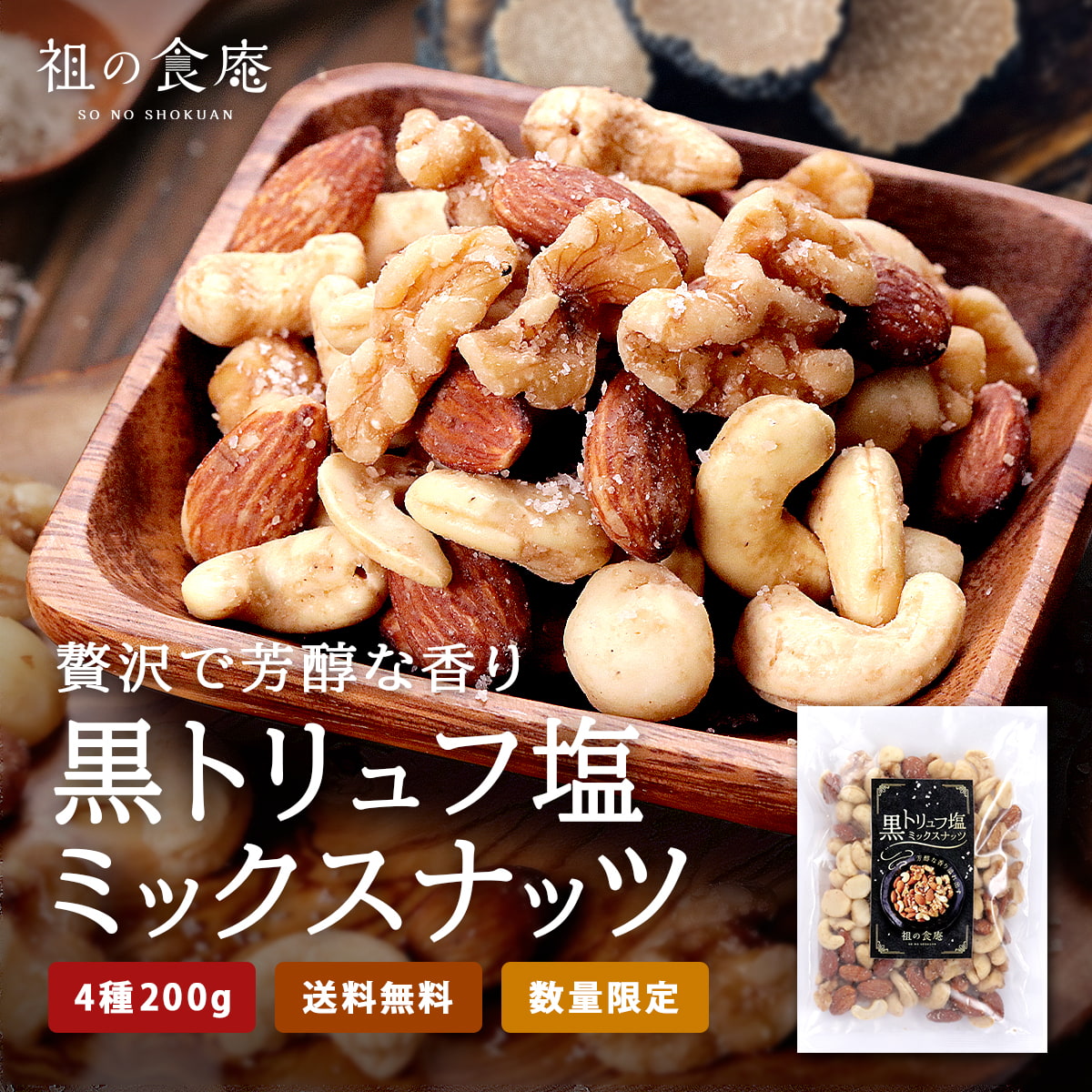黒トリュフ塩ミックスナッツ 200g≪原材料名≫アーモンド(アメリカ産)、カシューナッツ(インド産)、クルミ(アメリカ産)、マカダミアナッツ(オーストラリア産)、植物油脂、黒トリュフ塩/香料