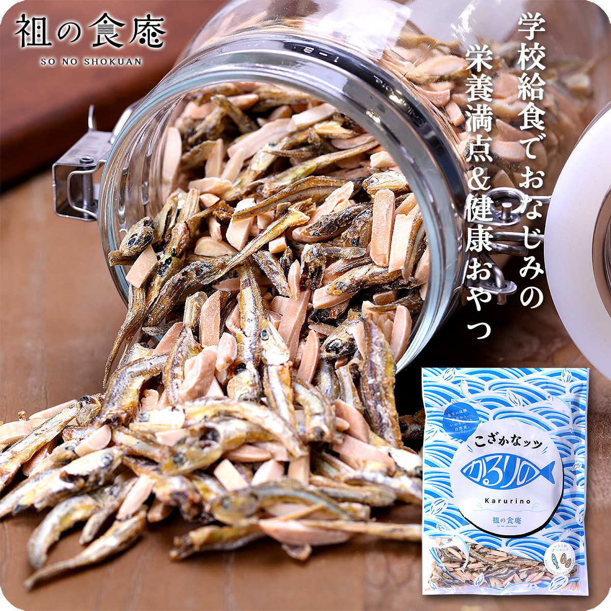 少し甘く味付けされた「いりこ(片口いわし)」と、香ばしくローストされた「アーモンド」が絶妙バランスの学校給食でおなじみの昔ながらの健康お菓子をご紹介!美味しさはもちろんのこと、カルシウムやDHA、不飽和脂肪酸(リノール酸&オレイン酸)など、小さなお子様からご年配の方に必要な栄養満点です。また、よく噛むことでダイエットや健康効果も期待できます。