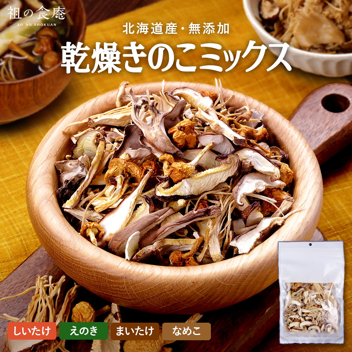 北海道産のしいたけ・えのき・舞茸・なめこを贅沢にブレンドした乾燥きのこミックス。