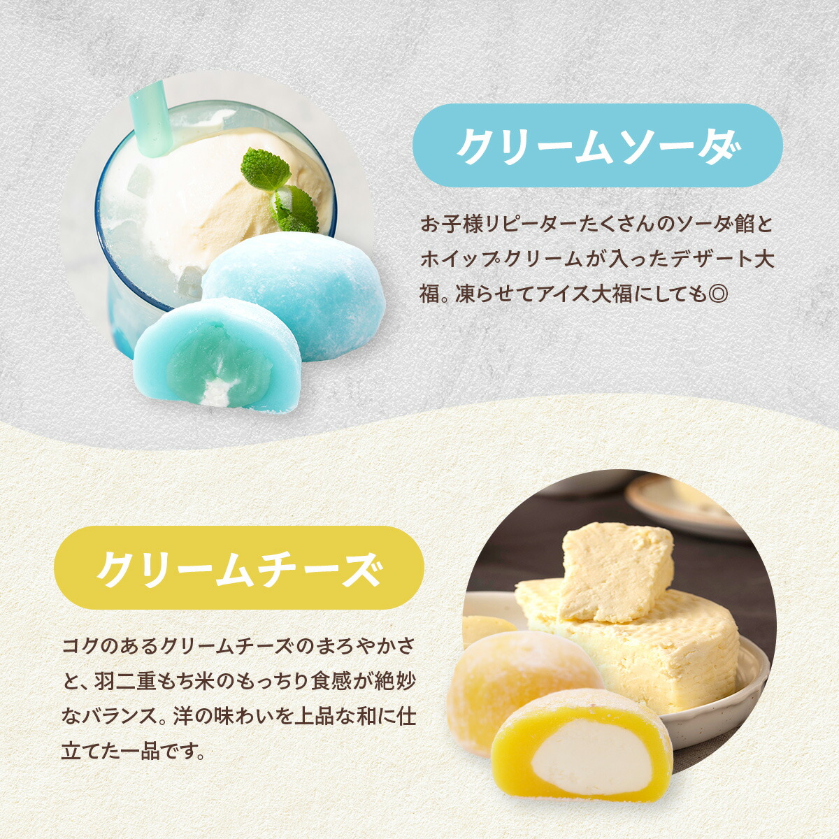 <原材料>ソーダ餡(国内製造)、もち粉、砂糖、ホイップクリーム、でん粉、もち米(滋賀県産)、/トレハロース、ソルビトール、酸味料(クエン酸)、乳化剤、酵素、香料、グリシン、pH調整剤、保存料(ポリリジン)、着色料(青1、カロテン色素)、(一部に乳成分・大豆を含む)