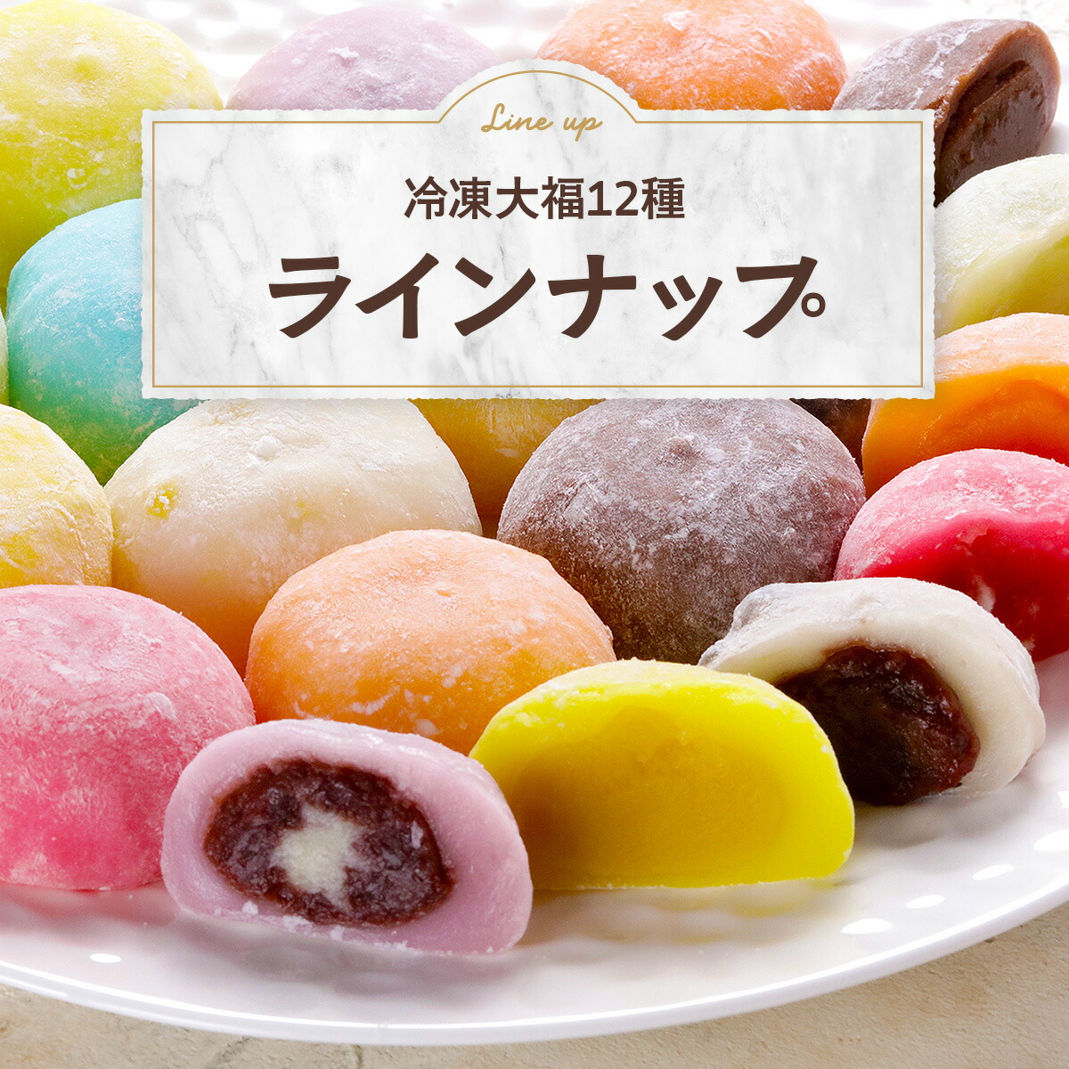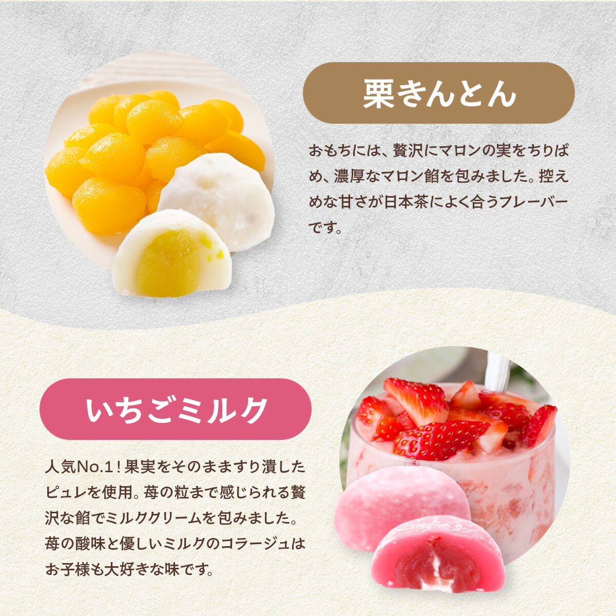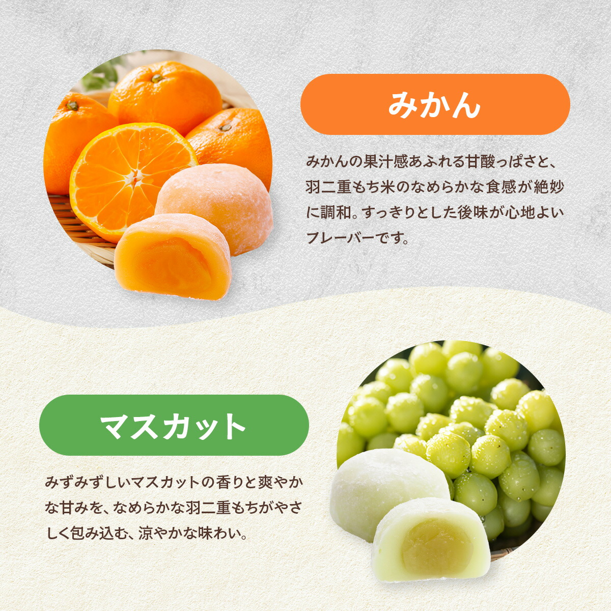 <原材料>マスカット風味餡(国内製造)、もち粉、砂糖、もち米(滋賀県産)、でん粉/トレハロース、ソルビトール、香料、乳化剤、酵素、グリシン、pH調整剤、保存料(ポリリジン)、着色料(紅花黄、クチナシ、黄4、青1)、(一部に乳成分・大豆・りんごを含む)