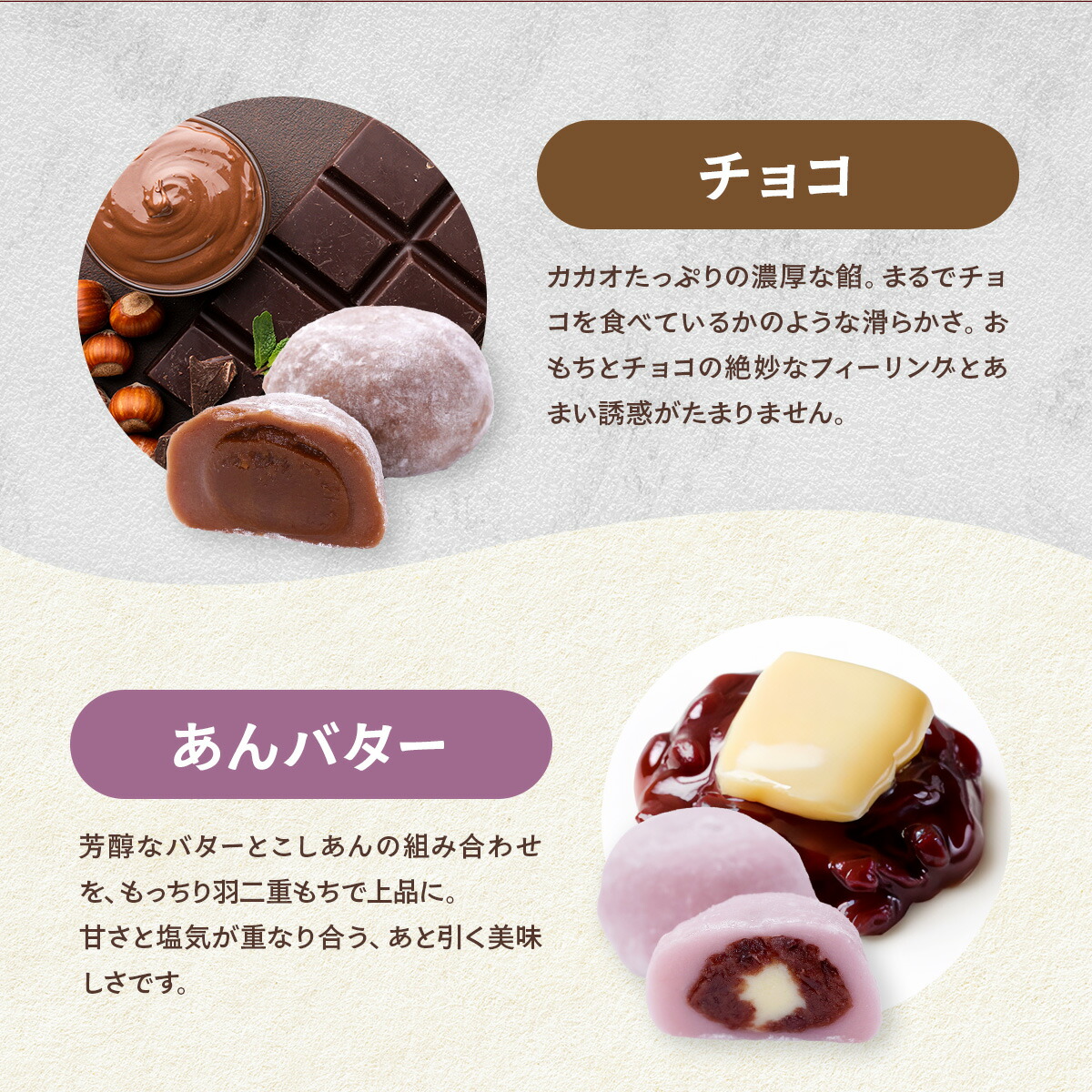 【7】チョコ大福<原材料>チョコレート餡(国内製造)、もち粉、砂糖、もち米(滋賀県産)、でん粉、ココアパウダー/トレハロース、着色料(カラメル色素、紅麹)、乳化剤、酵素、グリシン、香料、pH調整剤、保存料(ポリリジン)、(一部に乳成分・大豆を含む)
