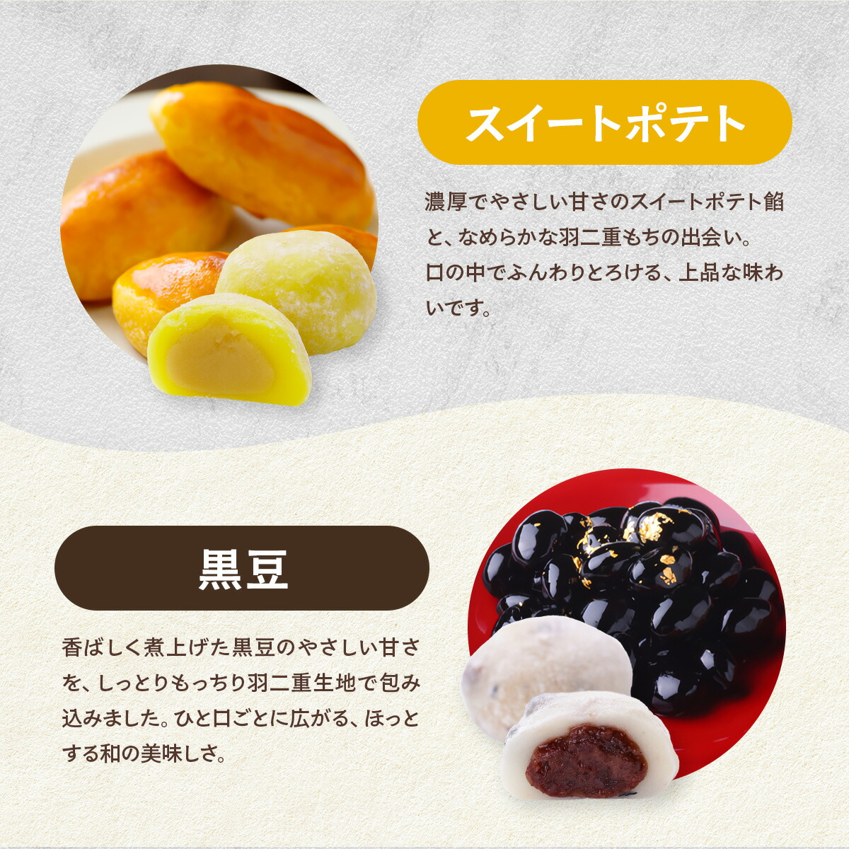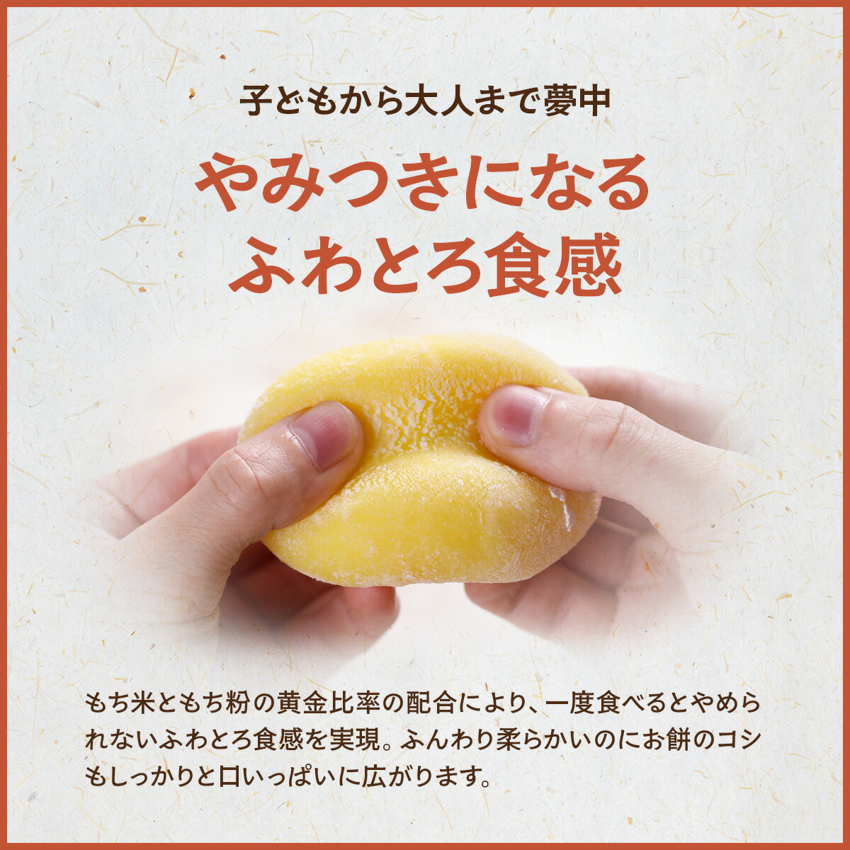 <原材料>スイートポテト餡(国内製造)、もち粉、砂糖、もち米(滋賀県産)、でん粉/トレハロース、ソルビトール、乳化剤、酵素、グリシン、pH調整剤、着色料(カラメル色素、カロテン色素、黄4)、香料、保存料(ポリリジン)、酒精、酸化防止剤(V.E)、(一部に卵、乳成分・大豆を含む)