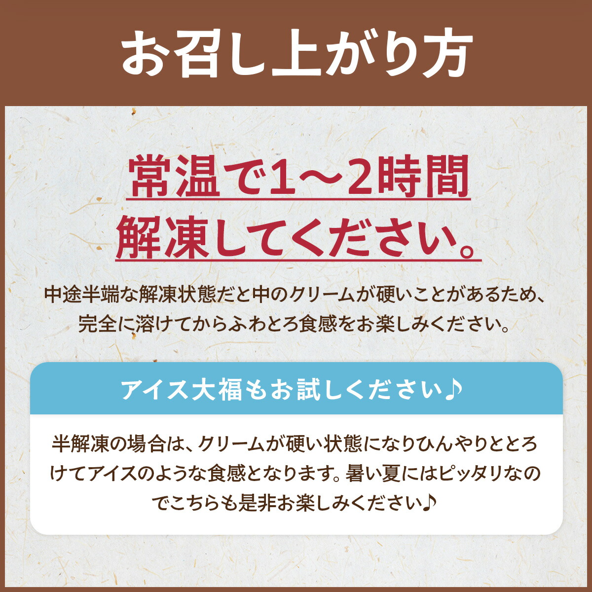 冷凍庫から出して 室温(20〜25℃)で30分〜1時間程度置いてお召し上がりください。夏場は表面のもちが柔らかくなった頃、中の餡が程よく冷たい状態がおすすめです。