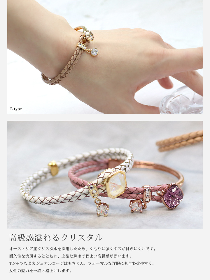 | 素材 | ・オーストリア産 スワロフスキークリスタル ・本革(牛革) ・ピューター合金・真鍮 |