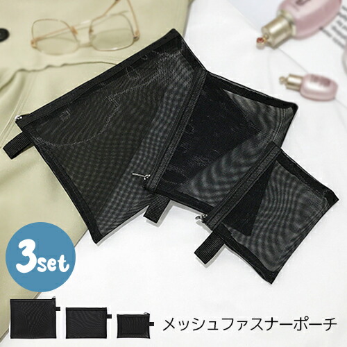 メッシュポーチ 3種セット マルチポーチ 小物入れ 小さい財布 旅行用 収納 中身が見える 日用品雑貨 編み 軽量 おしゃれ かわいい 仕分けポーチ無地 ブラック