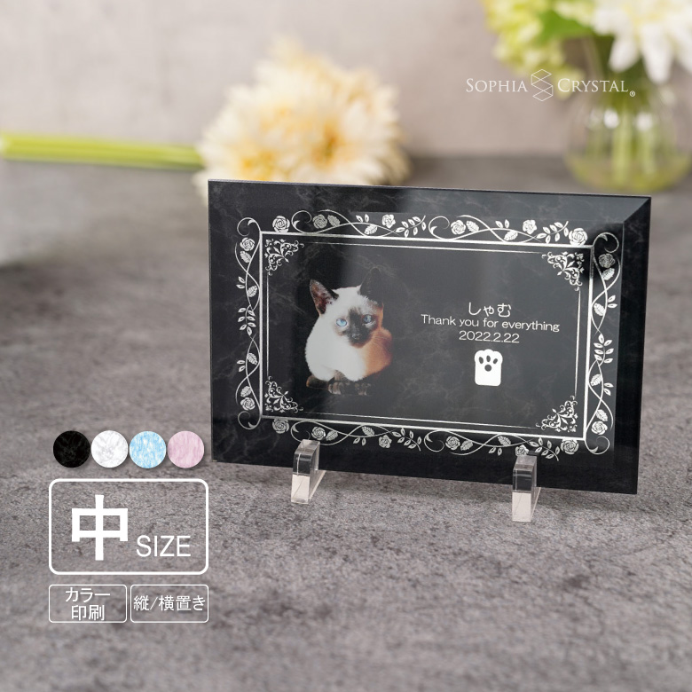 金/銀の文字と美しいデザインが上品に輝く大理石風のペットメモリアルです。淡いグリーンのガラスを使用した落ち着いたアンティーク調の仕上がりで、大理石風の背景カラーは黒、白、ブルー、ピンクの4種類よりお選びいただけます。