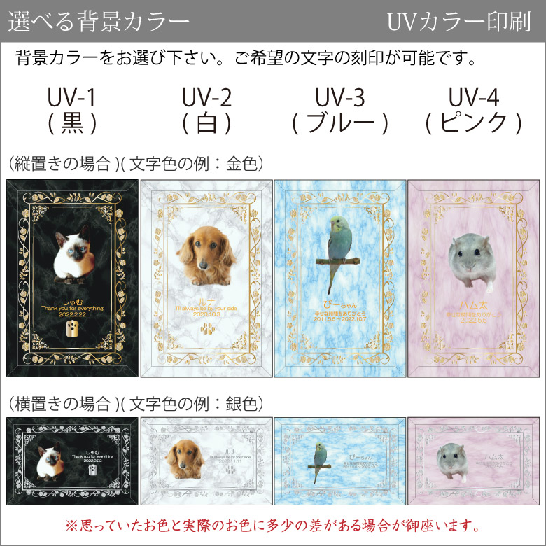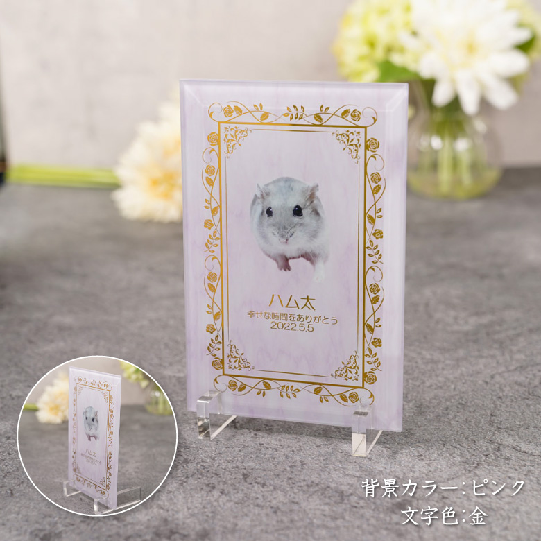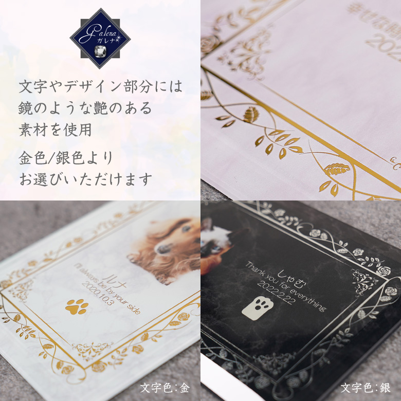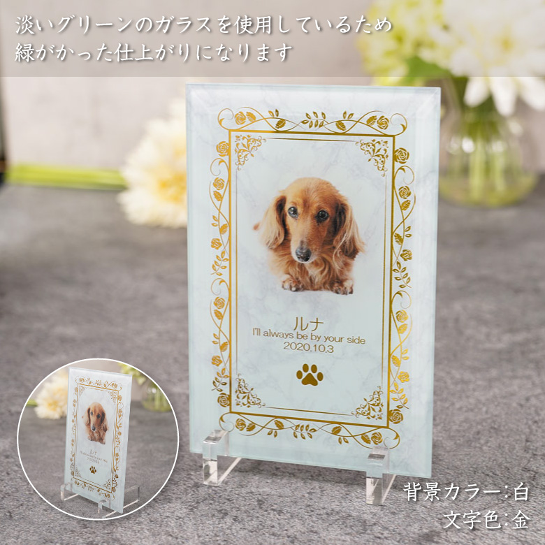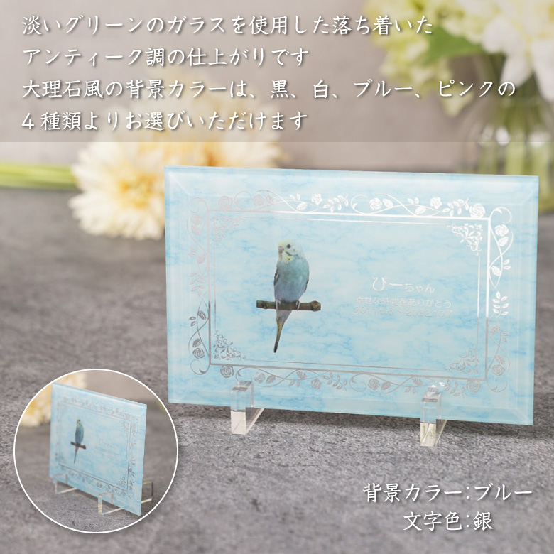 金/銀の文字と美しいデザインが上品に輝く大理石風のペットメモリアルです。淡いグリーンのガラスを使用した落ち着いたアンティーク調の仕上がりで、大理石風の背景カラーは黒、白、ブルー、ピンクの4種類よりお選びいただけます。