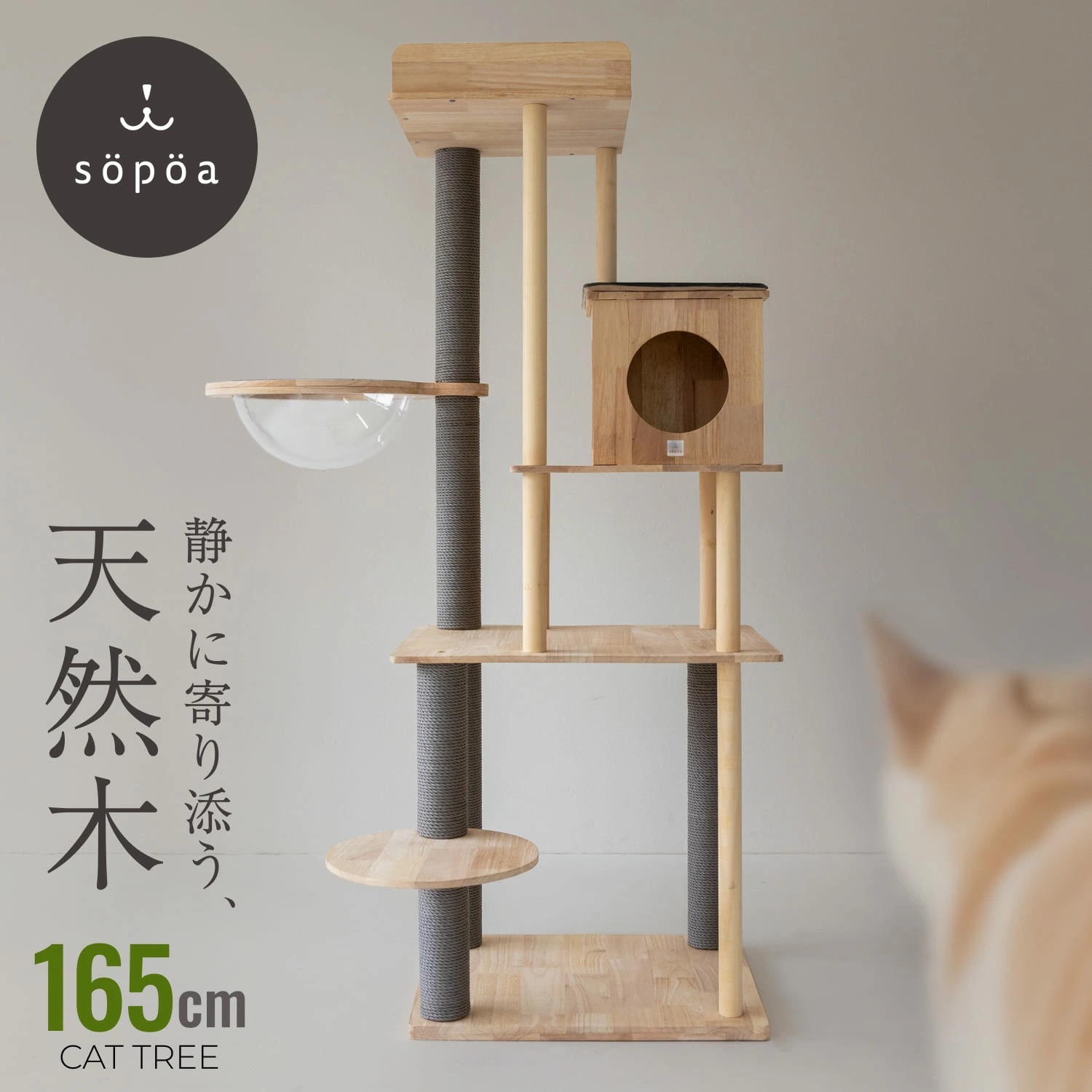 sopoa キャットタワー キャットツリー 木製 高さ165cm M 北欧風デザイン 爪とぎポールと大きな宇宙船付き 天然無垢材 多頭飼い
