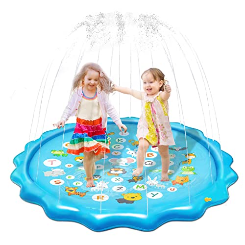 【可愛いプレイマット:】26の英字と多く動物からなるプレイマットはとても可愛いです。素敵な配色と可愛いデザイン、子供中に人気があります。子供たちは遊びながら簡単に学べ、子供の想像力を育てることができます。また、子供の遊びだけでなく、暑い日に、ペットちゃんも嬉しく遊べます。※ご注意:水を噴出し続けるためには、蛇口の水は出し続ける必要があります。