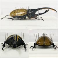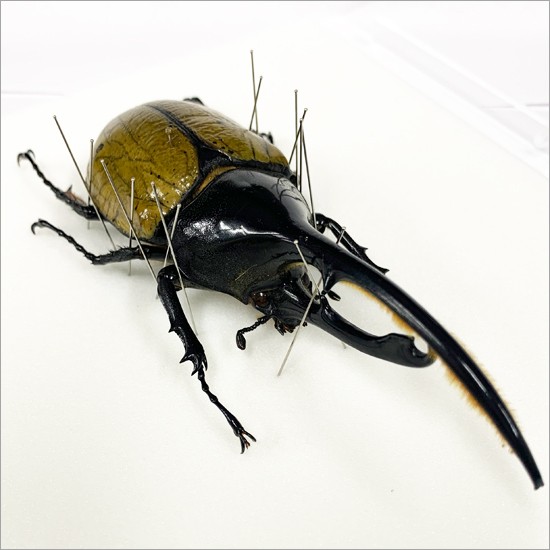 ●「昆虫界の職人」とも言えるプロの展翅人が、メタル風にデザインされたシャープな木製フレームにヘラクレスオオカブトムシを美しくディスプレイした新感覚の標本です。