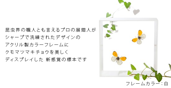 ●「昆虫界の職人」とも言えるプロの展翅人が、シャープで洗練されたデザインのアクリル製カラーフレームにクモマツマキチョウを美しくディスプレイした