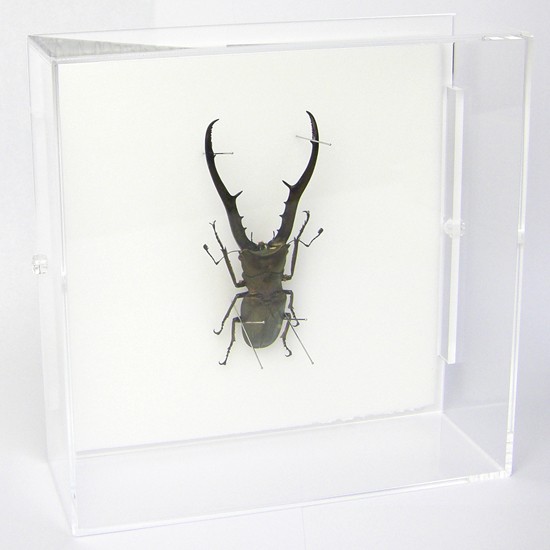 ●「昆虫界の職人」とも言えるプロの展翅人が、シャープで洗練されたデザインのアクリル製透明フレームにメタリフェルホソアカクワガタを美しくディスプレイした新感覚の標本です。