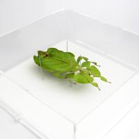 ●「昆虫界の職人」とも言えるプロの展翅人が、シャープで洗練されたデザインのアクリル製透明フレームにコノハムシ を美しくディスプレイした新感覚の標本です。