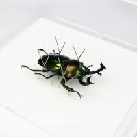 ●「昆虫界の職人」とも言えるプロの展翅人が、シャープで洗練されたデザインのアクリル製透明フレームにニジイロクワガタを美しくディスプレイした 新感覚の標本です。