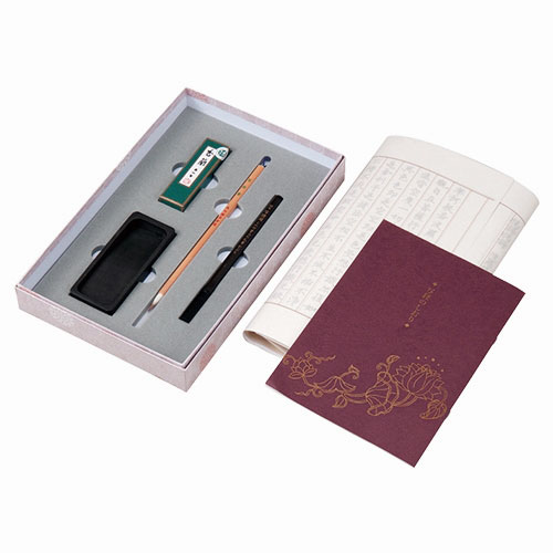 セット内容:写経用紙10枚、お手本×1、罫線入り下敷き×1、筆×1、筆ペン×1、硯×1、墨×1、写経のしおり×1