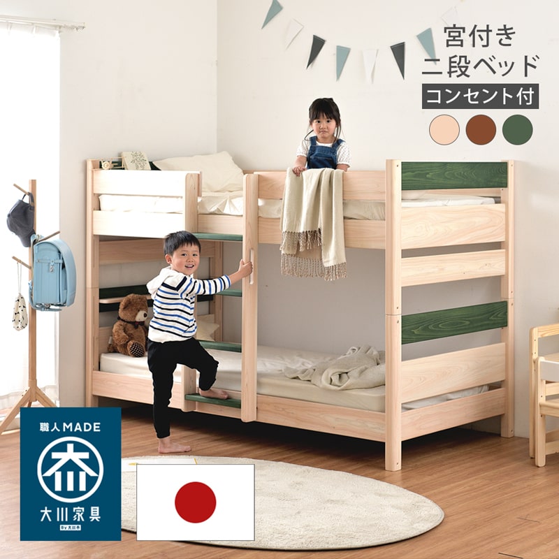 自社オリジナル 二段ベッド 分離 宮付き 子供 大人用 ロータイプ 2段ベッド ベッドフレーム 収納 ひのき 檜 桧 ヒノキ コンセント 抗菌 国産 大川 シャルマン