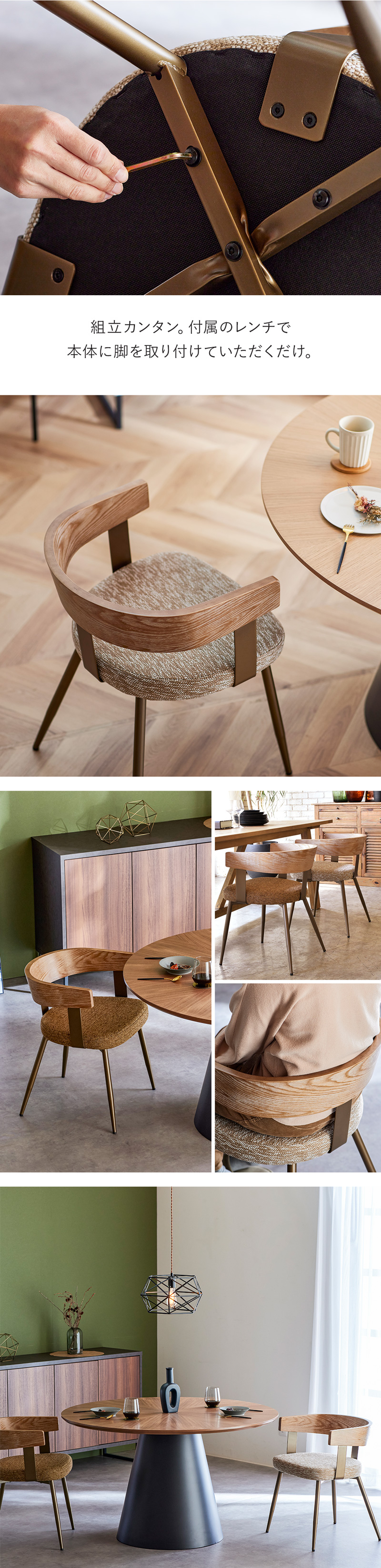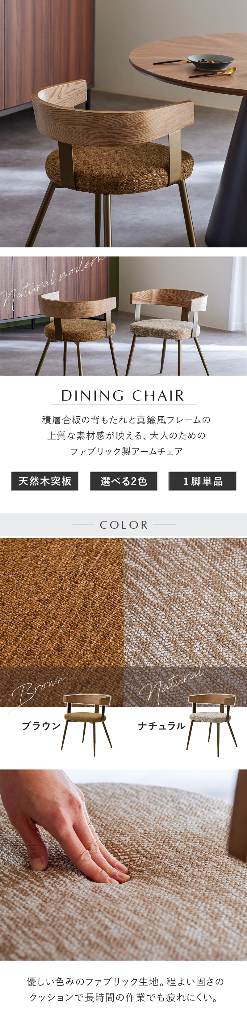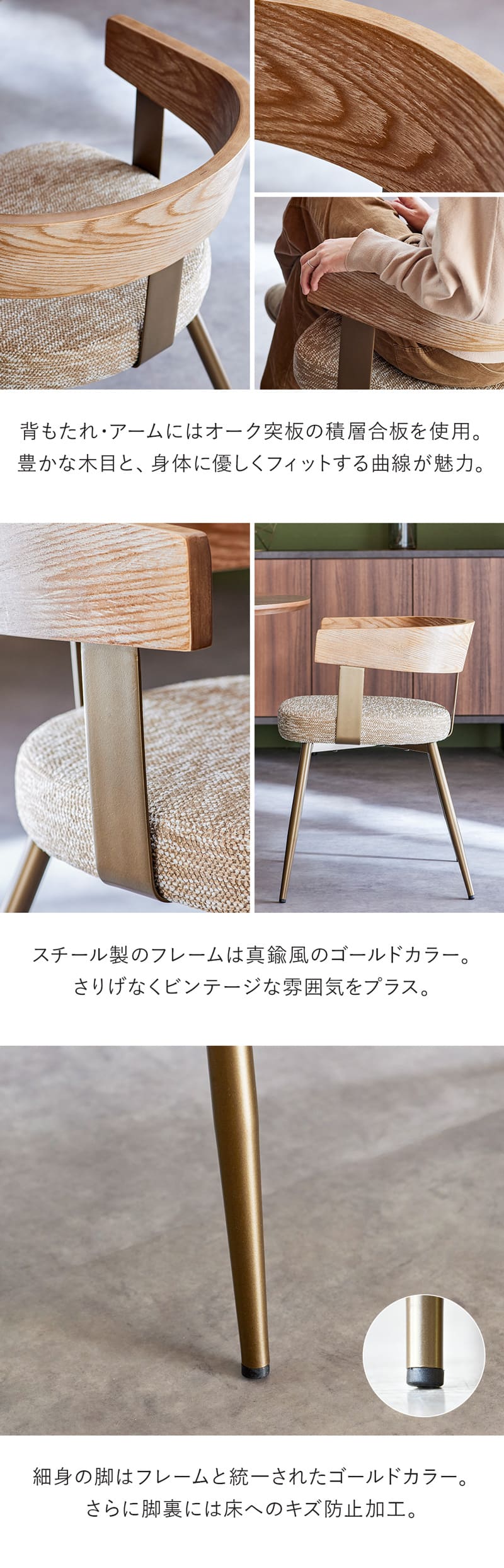 チェア ダイニングチェア アームチェア ひじ掛け 肘付き ファブリック 布張り 天然木 真鍮 ゴールド ナチュラル ベージュ ブラウン シンプル モダン 可愛い おしゃれ ミッドセンチュリー ヴィンテージ 北欧