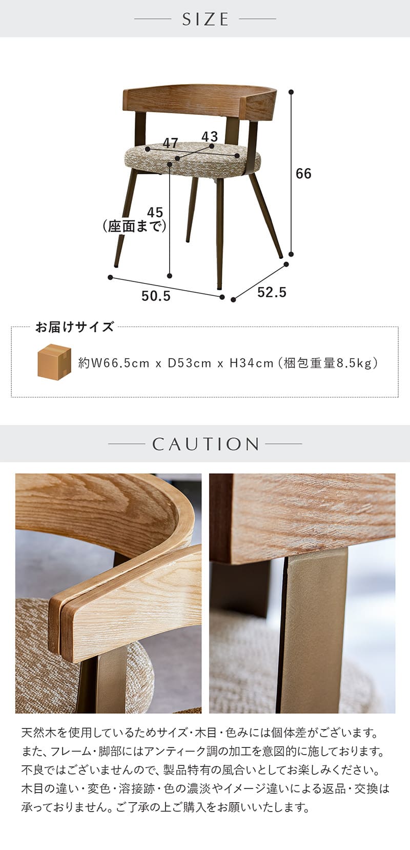 約W50.5cm × D52.5cm × H66cm (座面まで45cm)