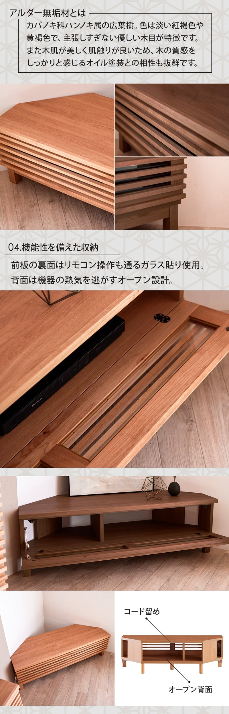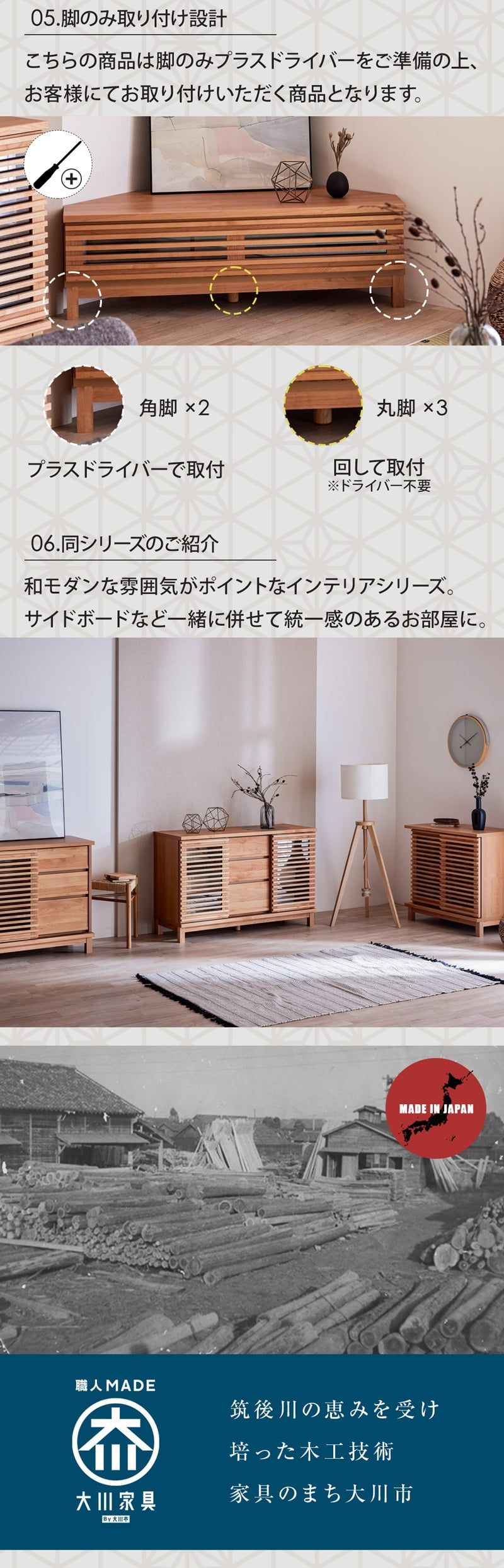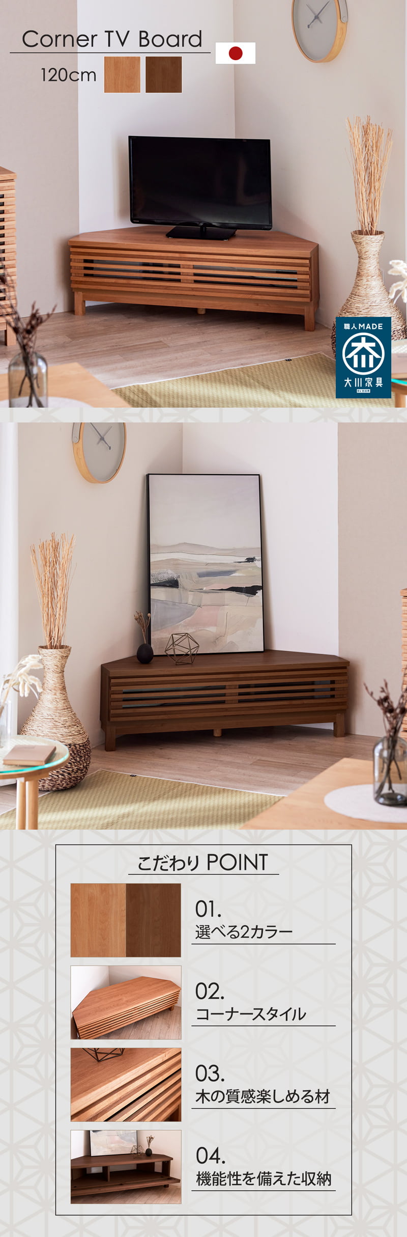 テレビ台 TV台 ローボード テレビボード スイングコーナー コーナータイプ コーナー ルーバーデザイン 120cm 大川家具 国産 日本製 アッシュ無垢材 ルーバーデザイン おしゃれ モダン 和モダン シンプル