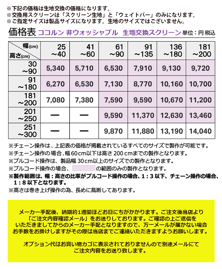 | 商品名 | ロールスクリーン ココルン 通常タイプ(洗えない)生地交換スクリーン ※交換用スクリーンは「スクリーン生地」と「ウェイトバー」のみになります。 |
