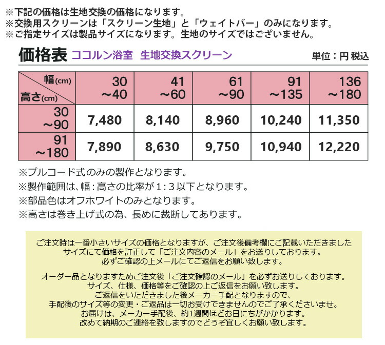 | 商品名 | ロールスクリーン ココルン浴室 ウォッシャブル仕様(洗える)生地交換スクリーン ※交換用スクリーンは「スクリーン生地」と「ウェイトバー」のみになります。 |