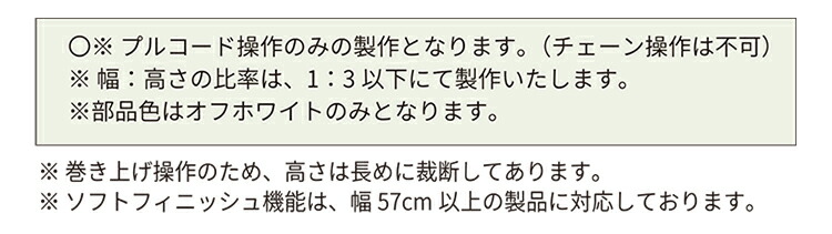 | 操作方法 | プルコード式 ※チェーン式は製作できません。 ※操作方法により仕上がり生地巾が異なります。 |