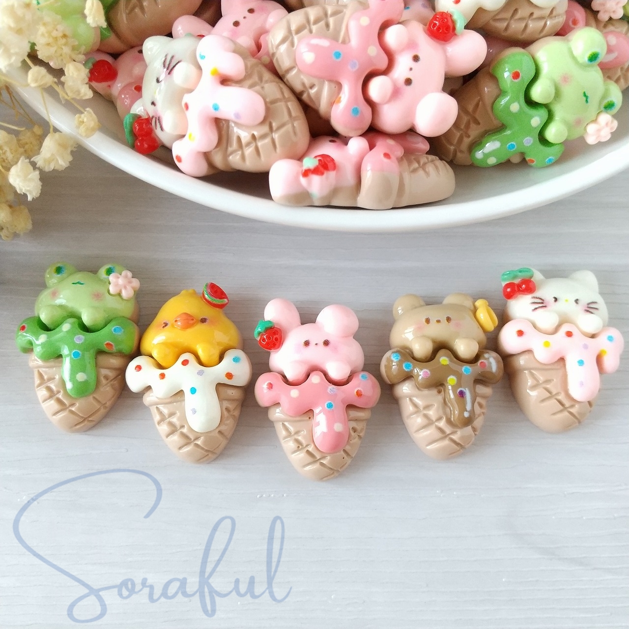 デコパーツ アイスクリームコーンアニマル 動物 ソフトクリーム スイーツ 5個 貼付けパーツ D-0298