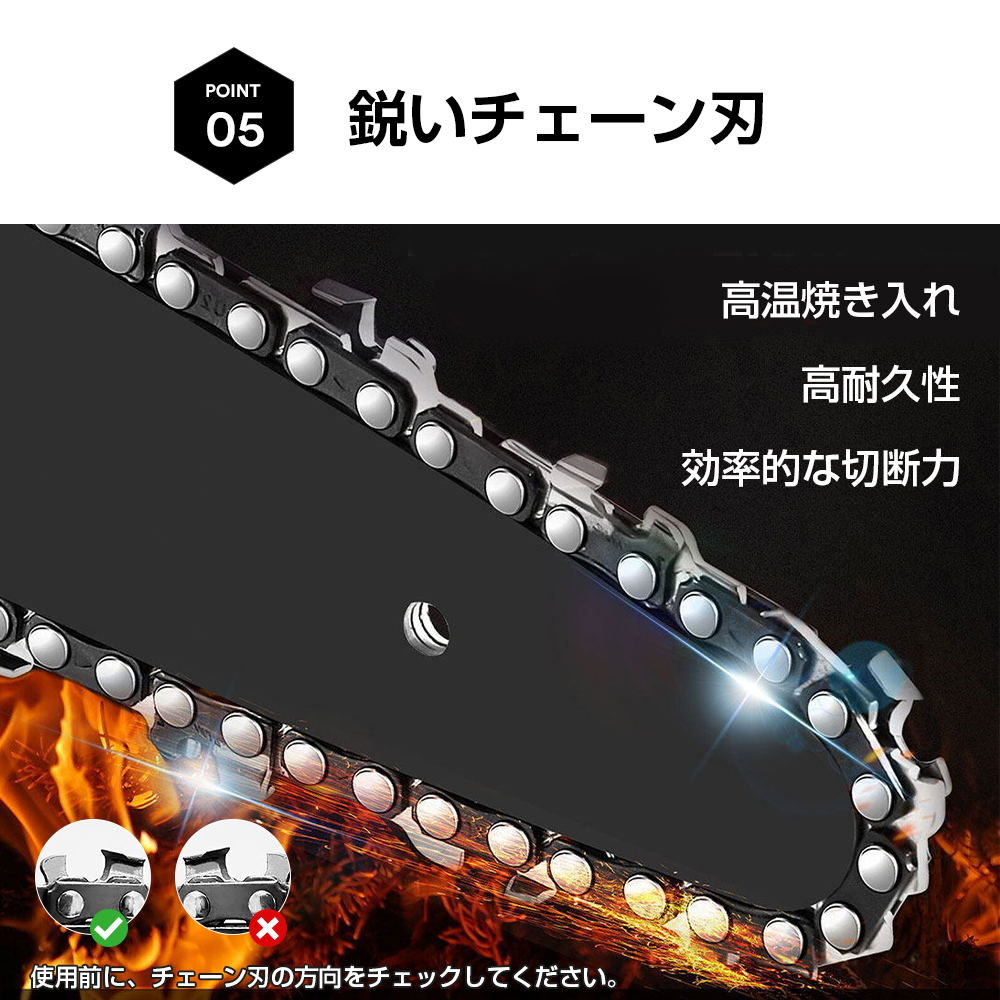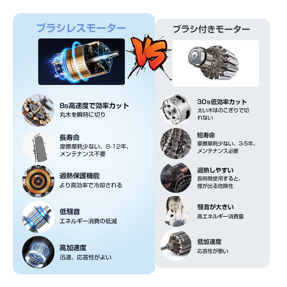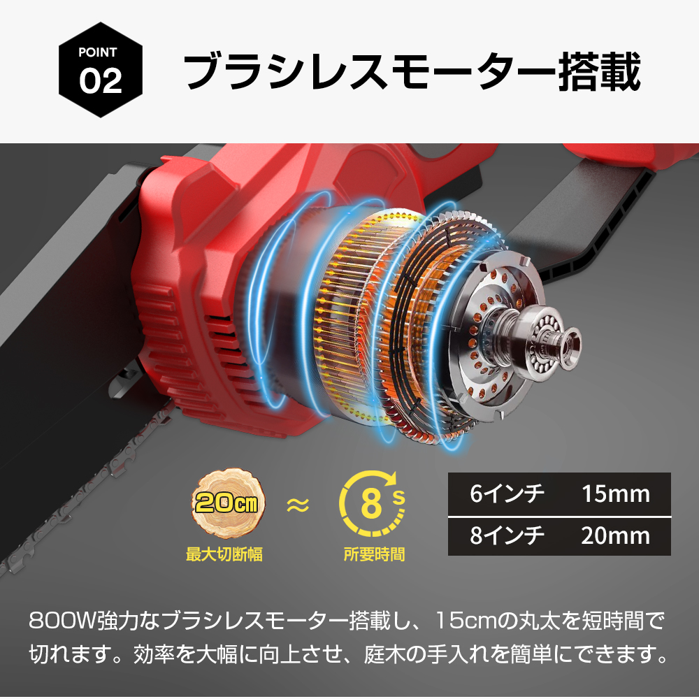 【強力なモーター・倍増の効率】OKUYOSHI充電式チェーンソーは、800Wブラシレスモーターを搭載し、使用中の回転数は1分あたり6000回転に達します。チェンソーメーカーの90%は、コストを節約するために安いブラシ付き銅モーターを使用します。それは簡単に煙や火傷です。ブラシレスモータは完全にこの問題を解決します。あなたのコードレスチェーンソーは、10倍の働く生命を得ることができます。モーターの新時代はブラシレスモータだ!<br>