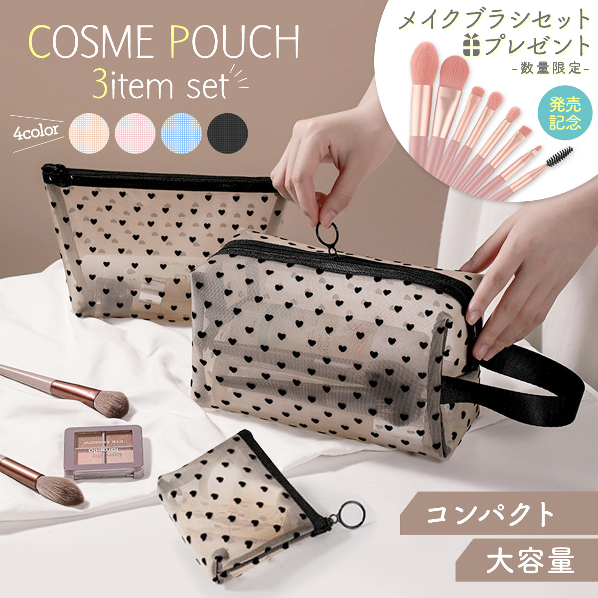商品名:化粧ポーチ コスメ ポーチ 3点セット コスメ 小物入れ バッグ メイクブラシ メッシュ コンパクト 大容量 旅行ポーチ 洗面ポーチ ハート 可愛い おすすめ