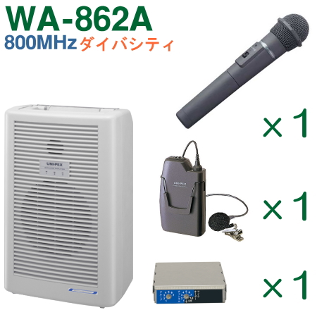 ユニペックス 800MHz帯 ワイヤレスアンプ WA-862A (ダイバシティ)+ワイヤレスマイク(2本)+チューナーユニットのセット [ WA-862A-Cセット ]