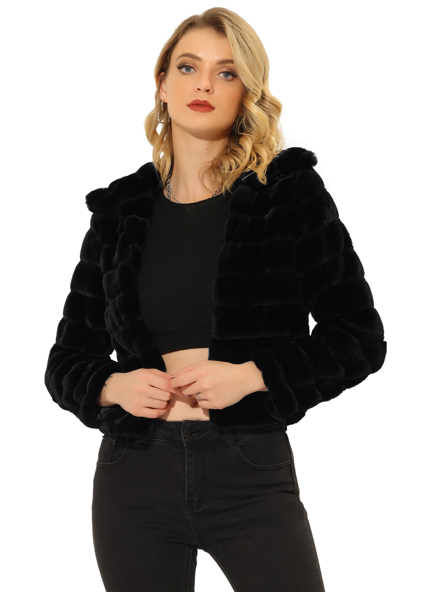 ポイントカラーとポケットが付いたこのふわふわのクロップオーバーコートは、寒い日には暖かくなります。