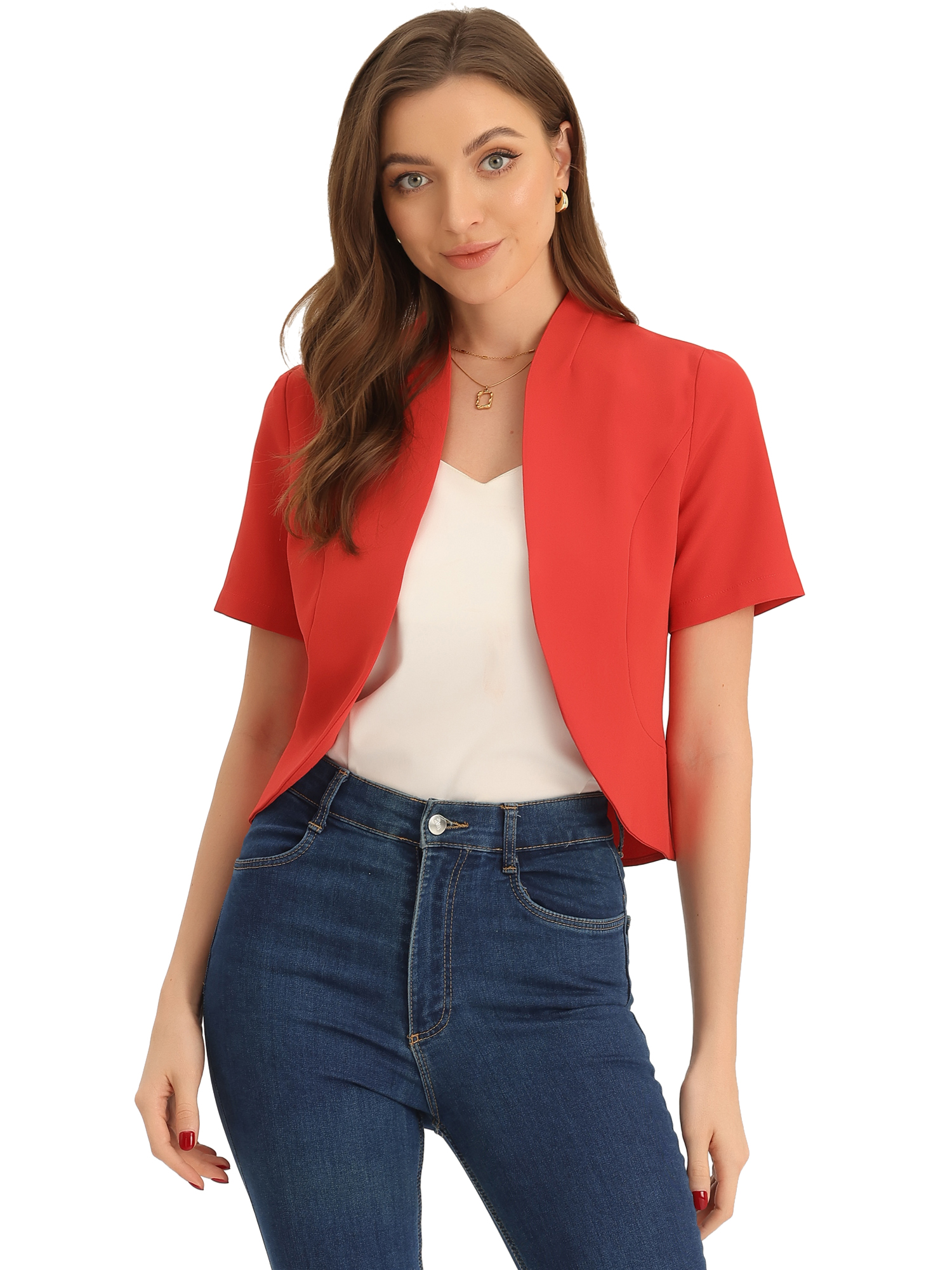 Allegra K カーディガン ポレロ 通勤 無地 ビジネス ブレザー 上品 オープンフロント 半袖 ノーカラー レディース レッドxS