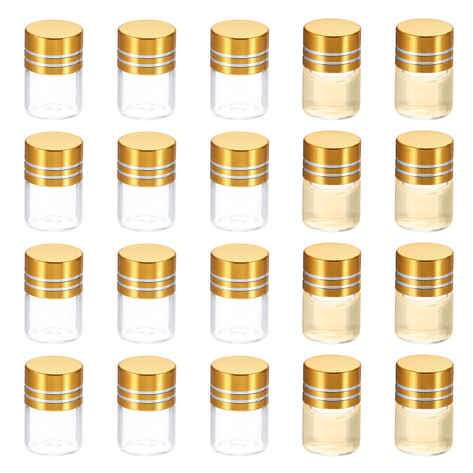 ボトルの材質: ホウケイ酸ガラス、?? キャップの材質: アルミニウム、カラー:透明、金色、容量:1mL、キャップのサイズ:10.5x15.6 mm(H*外径)、ボトル口外径:12.5 mm、ボトルサイズ:20.8 x 16 mm(H*外径)、全高:24 mm、パッキングリスト:20 x スクリューキャップ付きガラスバイアル