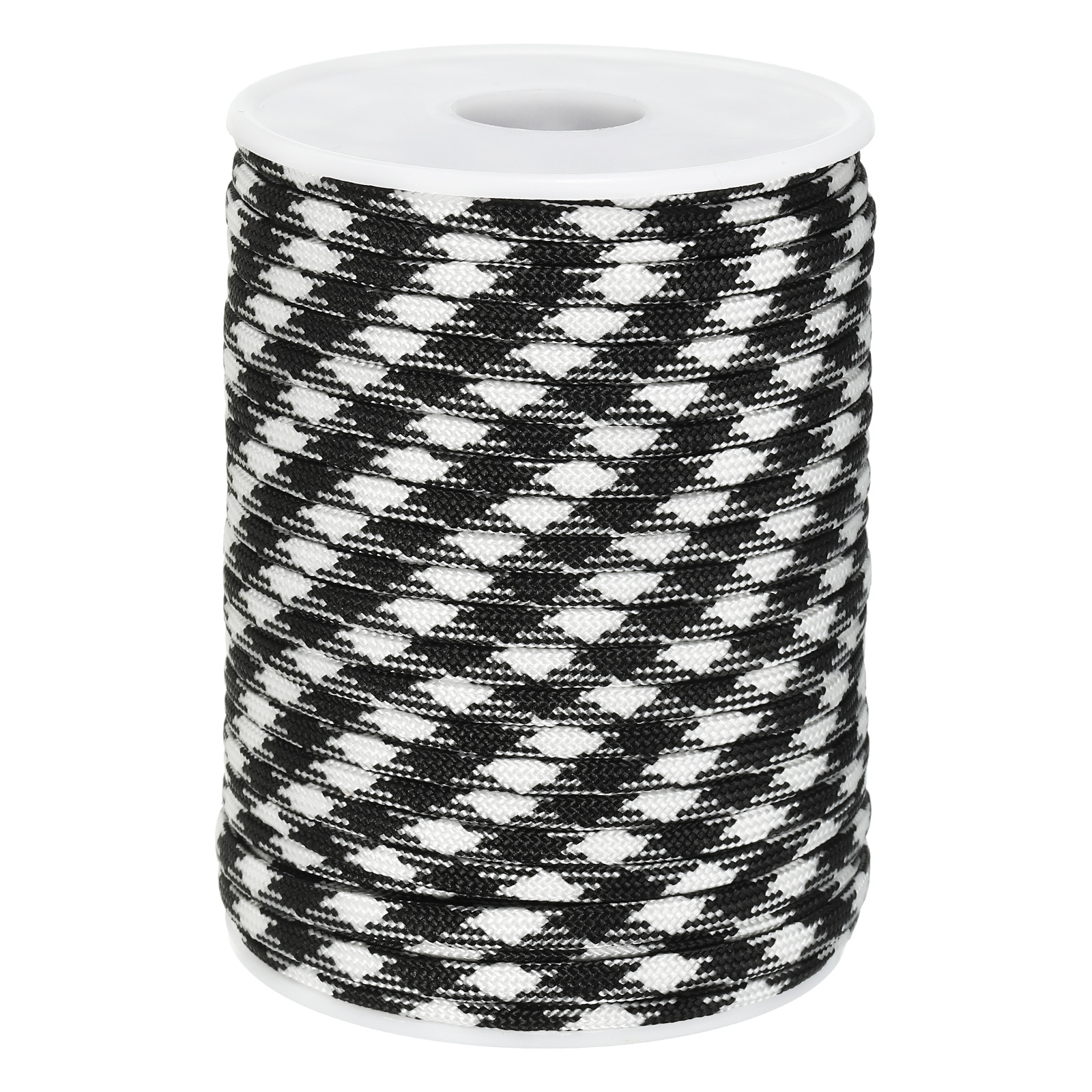 カラー:黒アンドホワイトチェッカー<br>素材:ポリプロピレン繊維<br>直径:4mm/ 1/8"<br>内部コア:7本のストランド<br>長さ:30m / 98フィート<br>パッキングリスト:1巻き x パラコードロープ