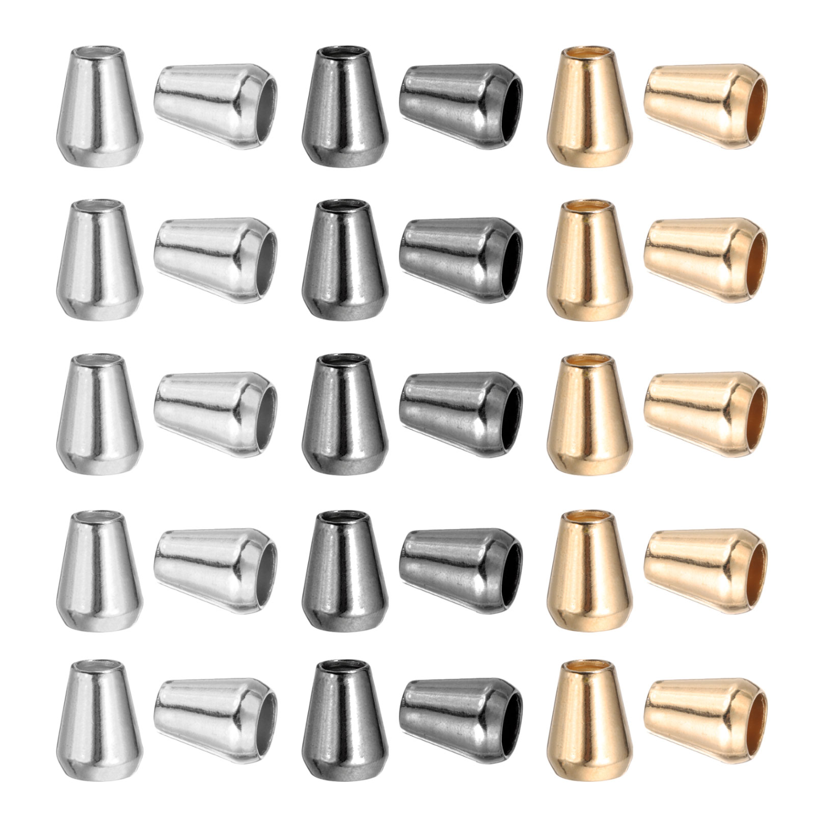 カラー: シルバー,グレー-黒,ゴー ルデン; 材質: 金属; 最小穴径:4 mm; 全体サイズ:11 x 14 mm(DxH); パッキングリスト: 30 x ベルエンドストッパー(各色10個)