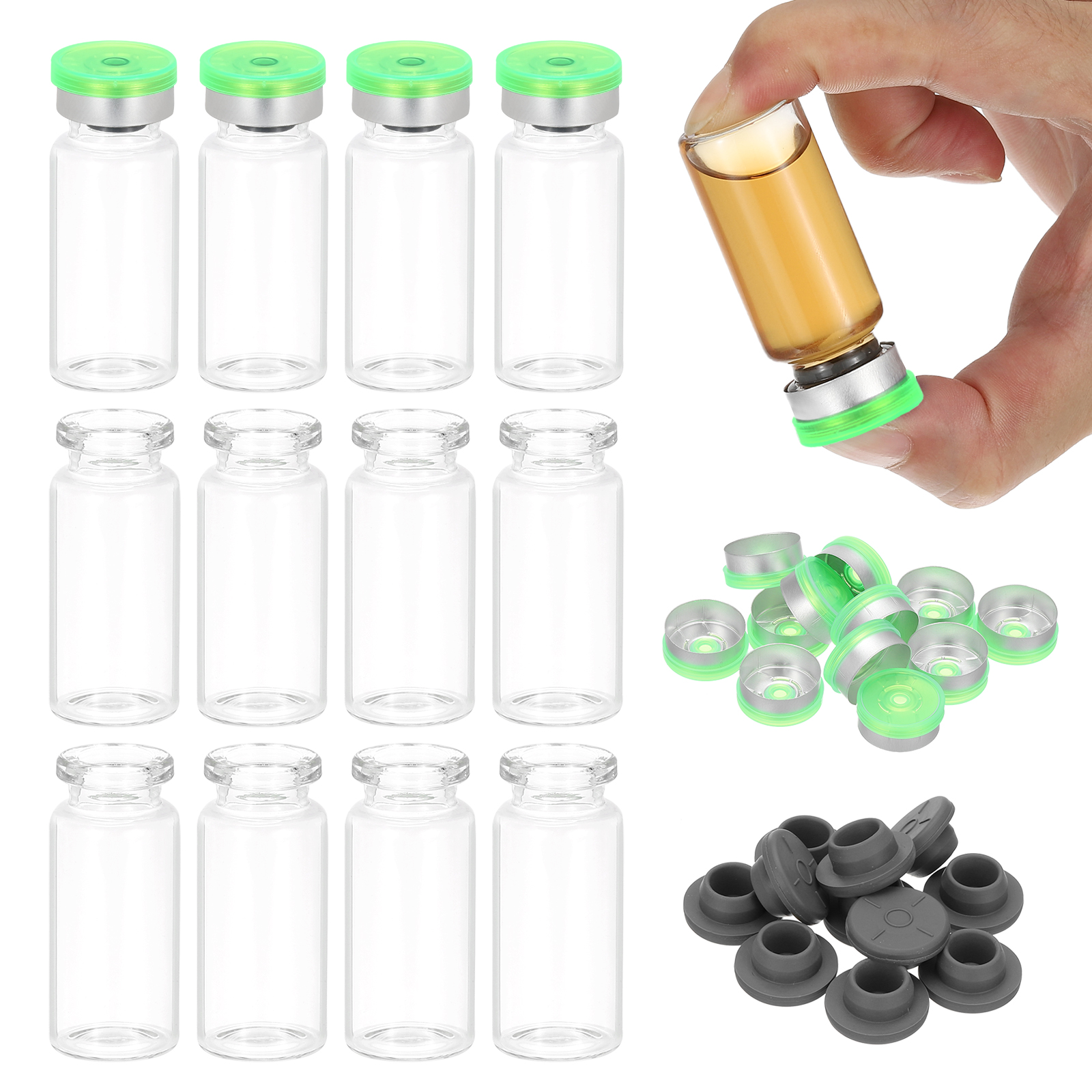 PATIKIL 12個 10ml クリアボロシリケートガラスサンプルビアル アルミプラスチックキャップ ゴムストッパー付き 緑シルバートーン